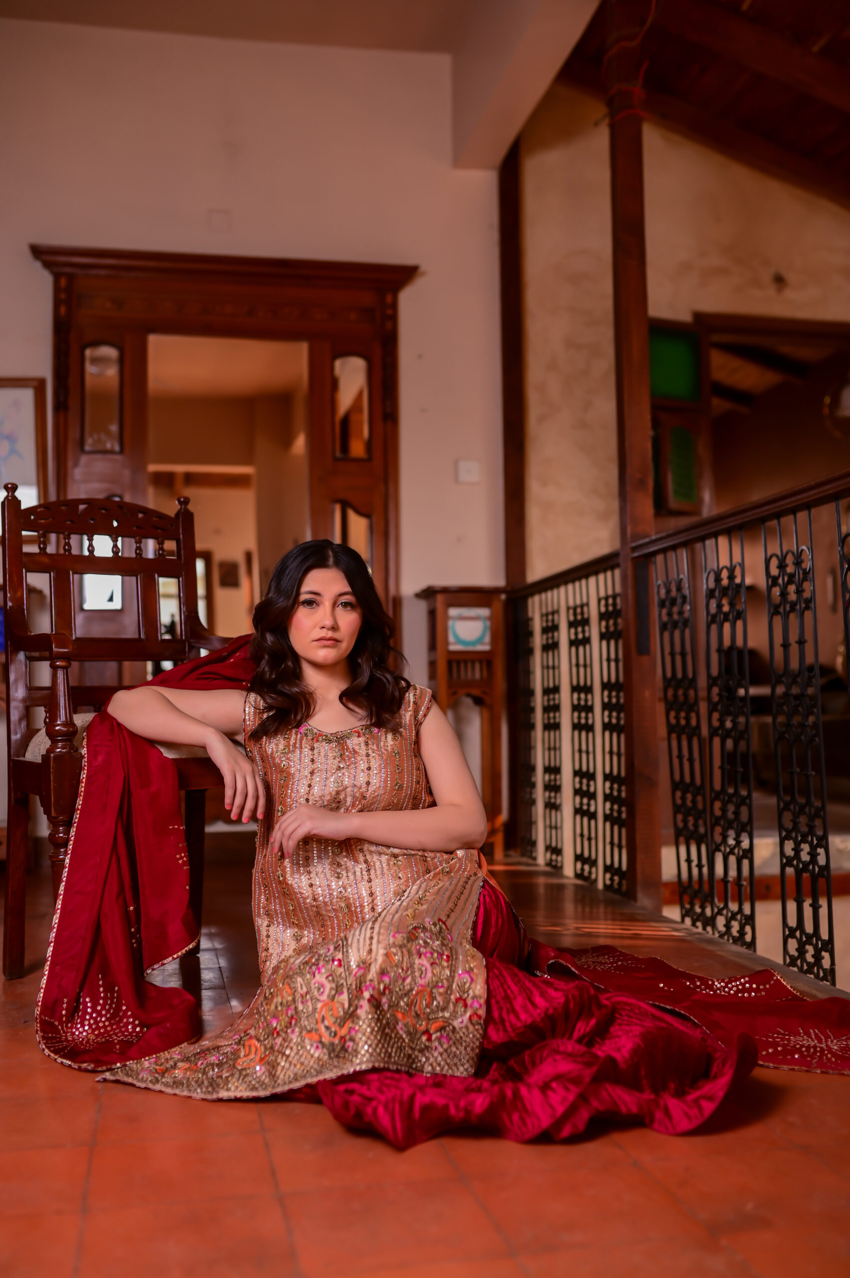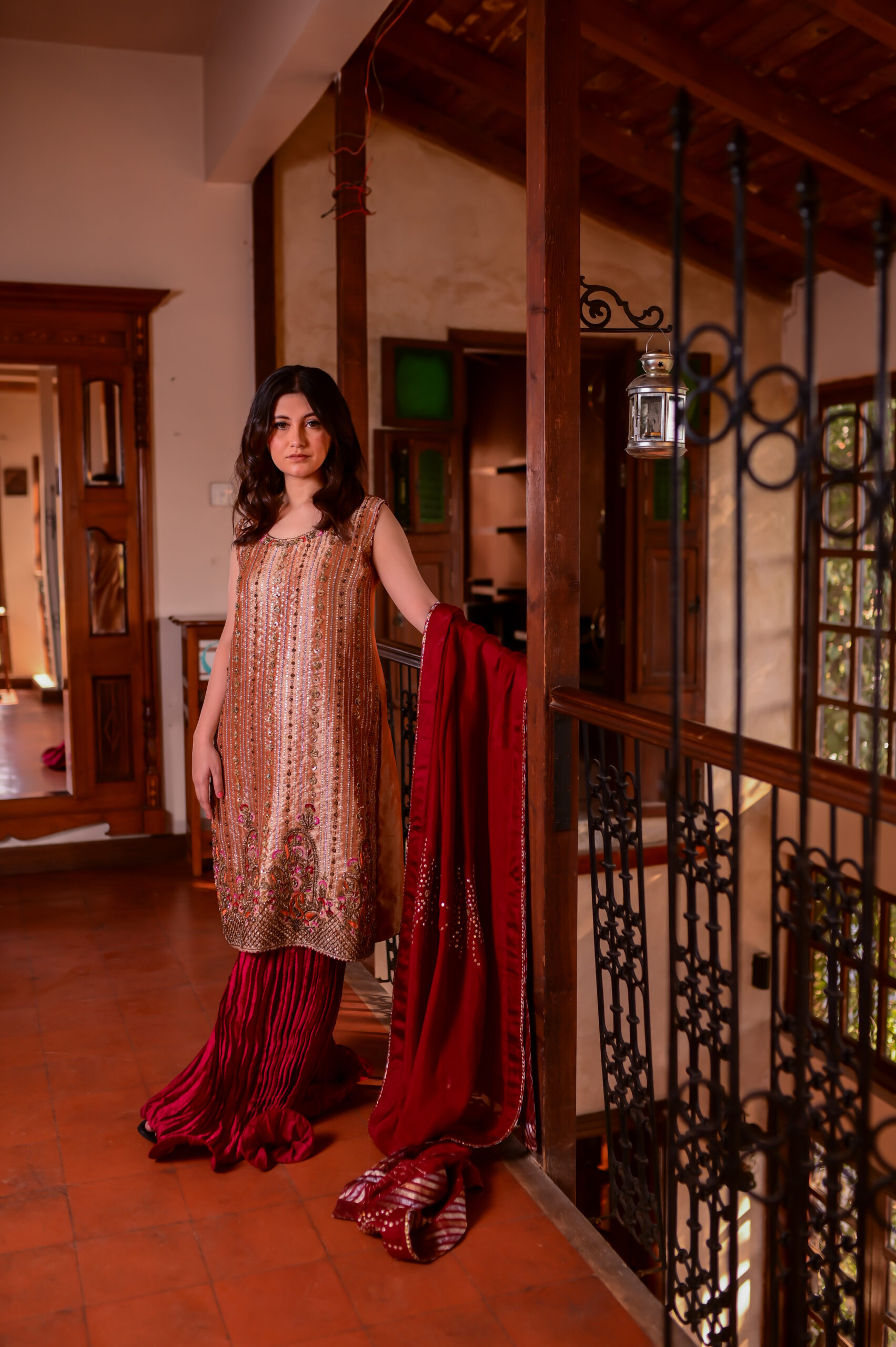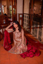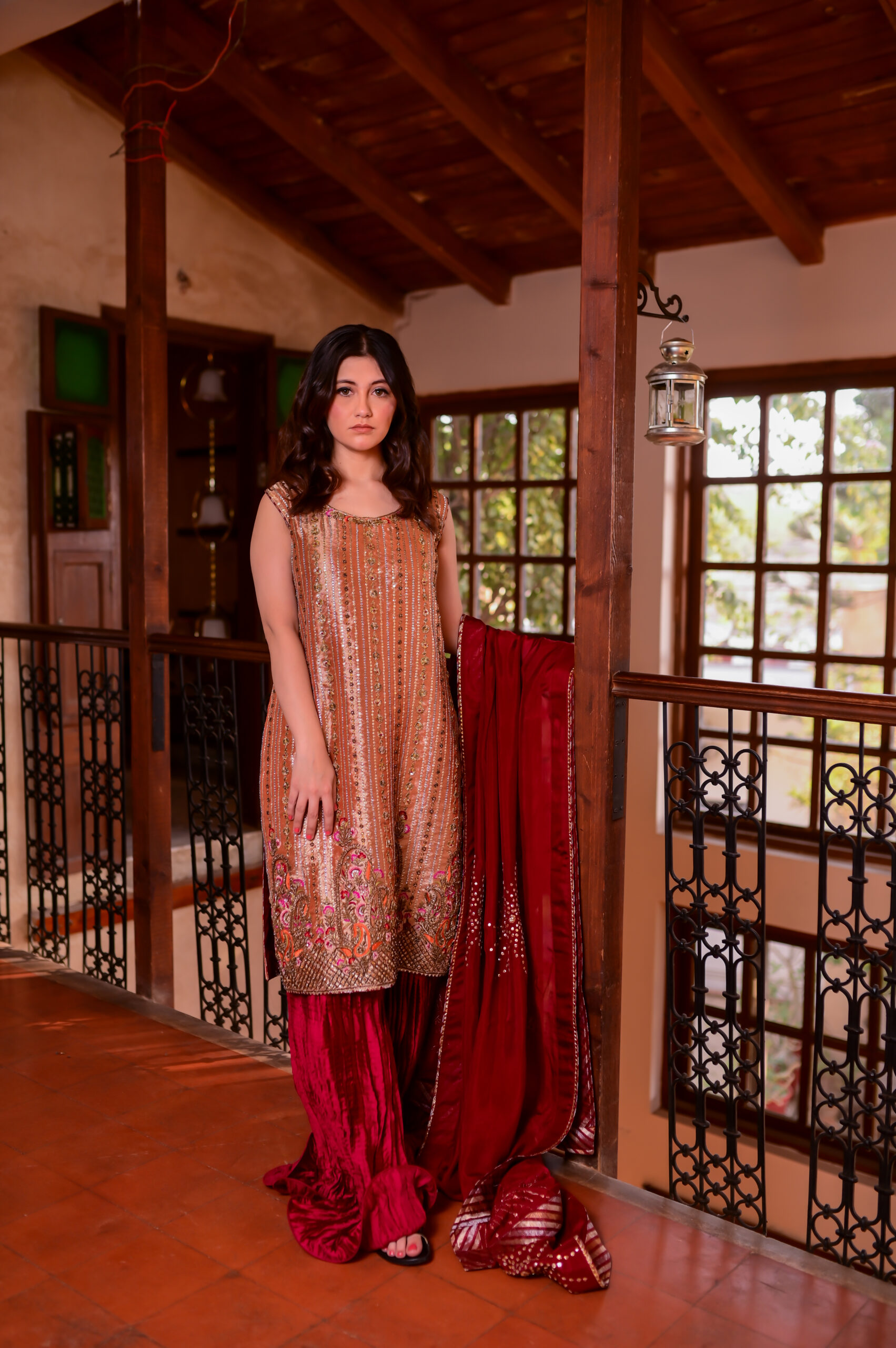 A true celebration of colors, this bahaar ensemble with a classic dhaka pajama radiates the joyous spirit of festivity. At its heart lies the vibrance of red, beautifully balanced with the soft gleam of gold accents, creating a look that is both regal and timeless. The silk dupatta drapes gracefully, adding fluidity and richness to the outfit, while the intricate detailing on the dress enhances its festive charm. Perfectly embodying the essence of Basant, this attire symbolizes beauty, tradition, and the cheerful spirit of celebration.