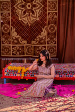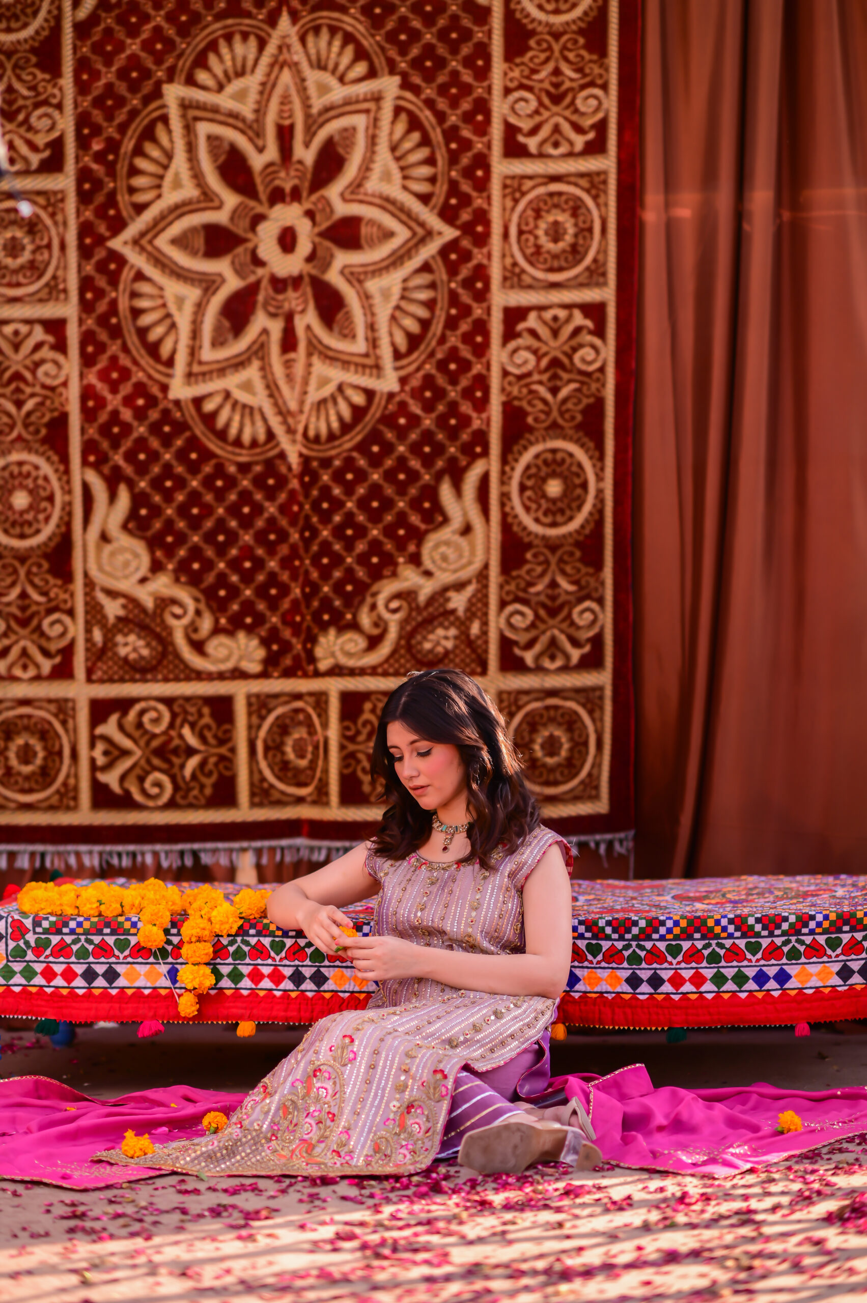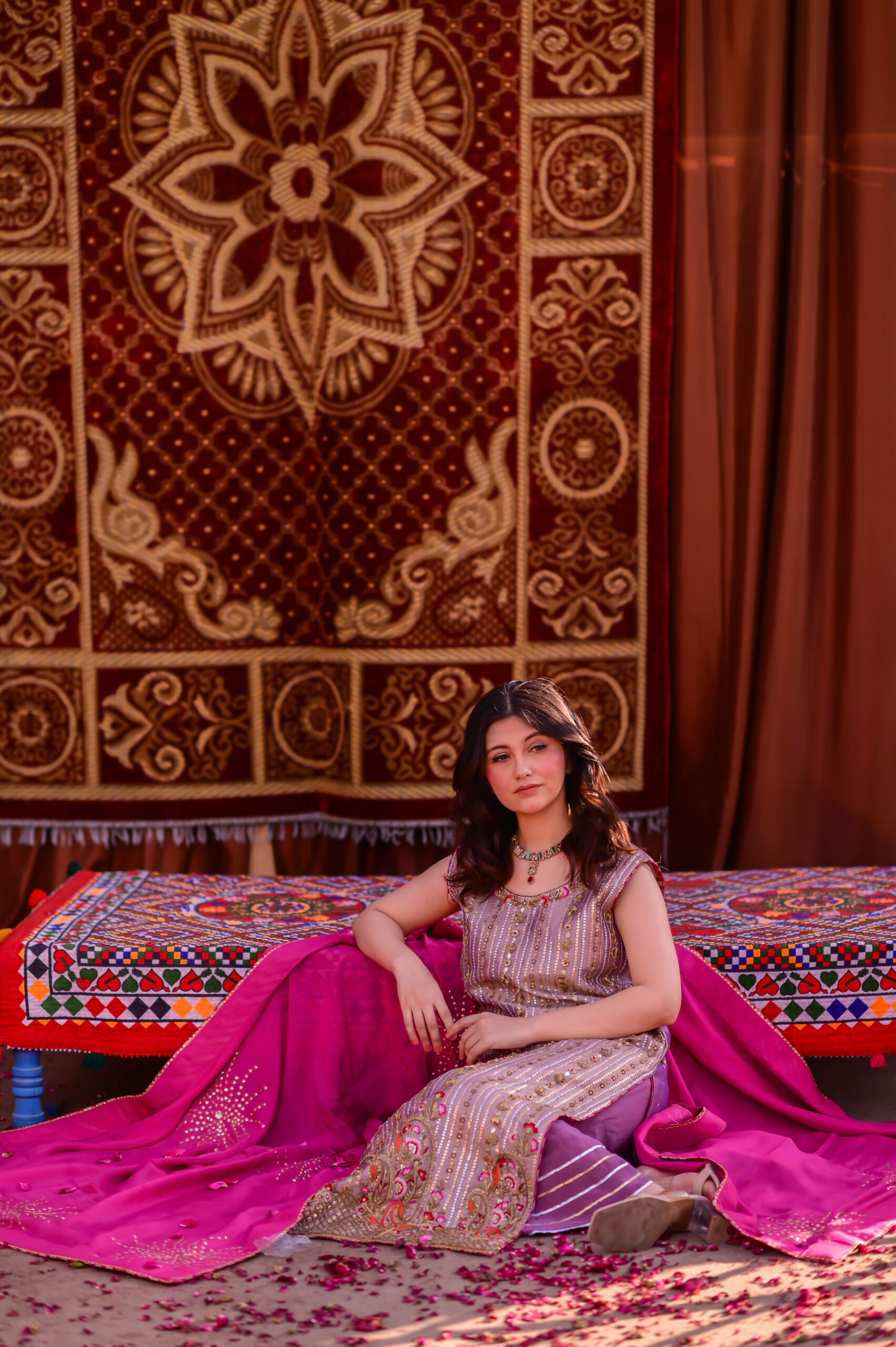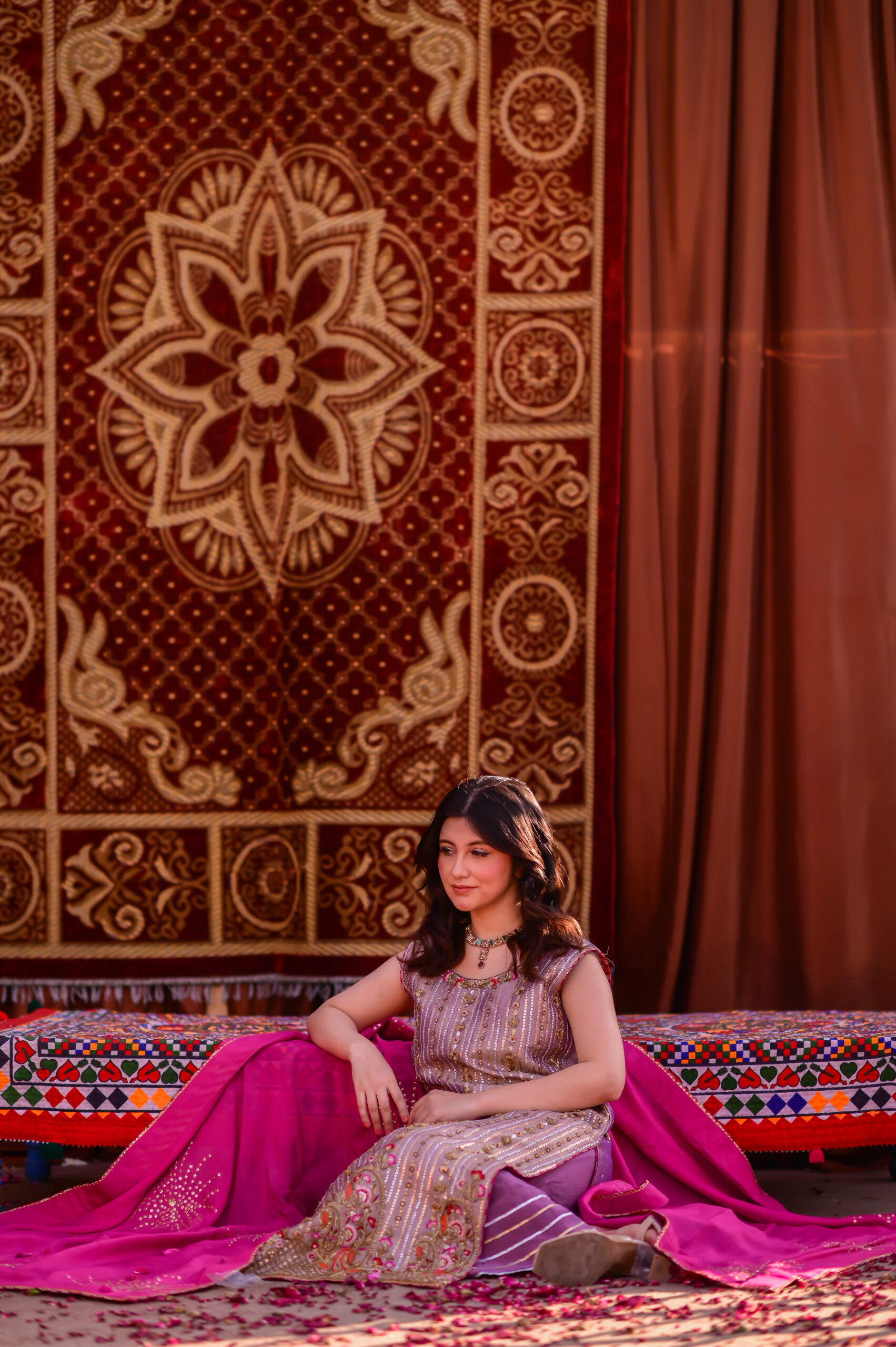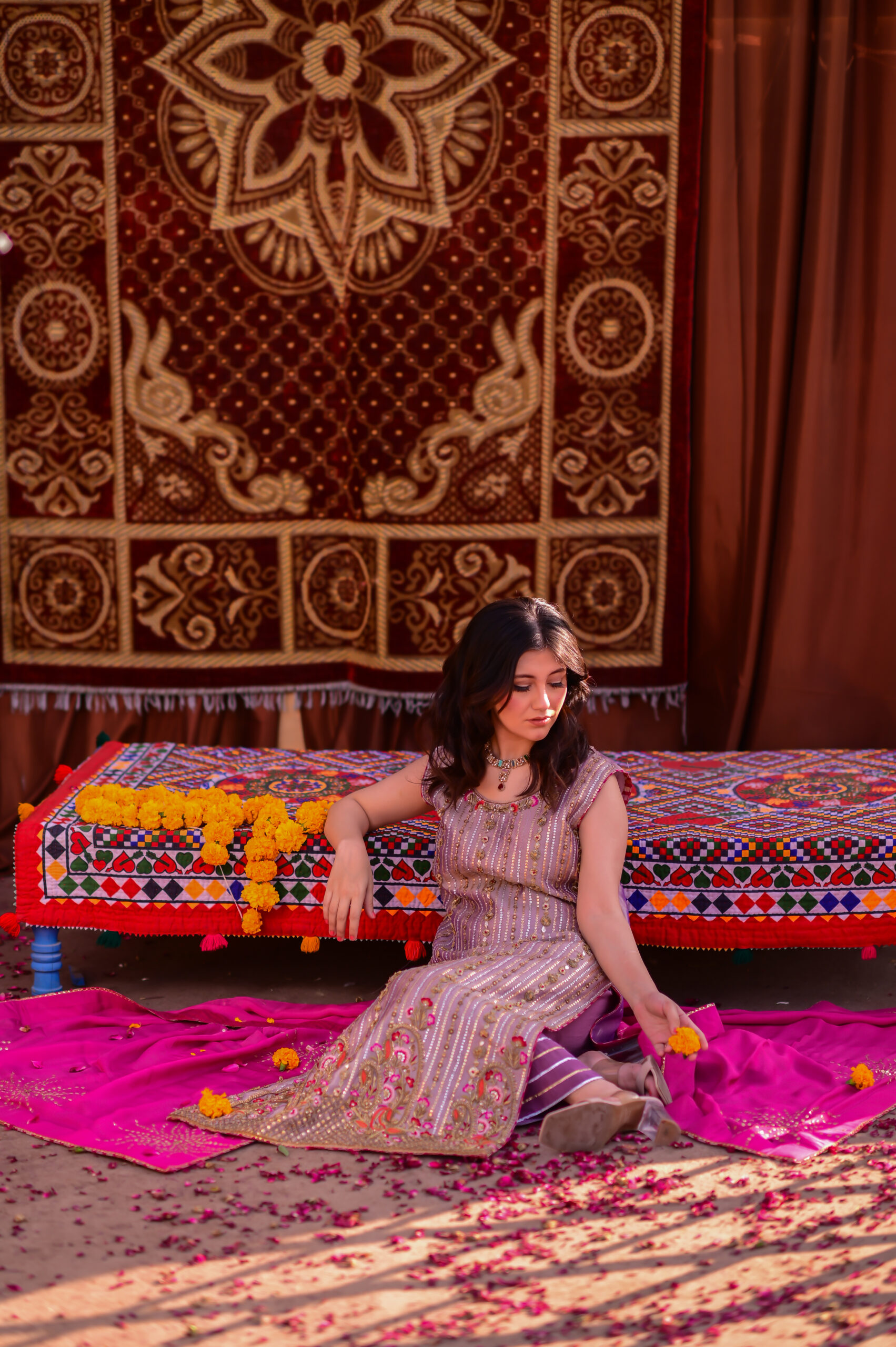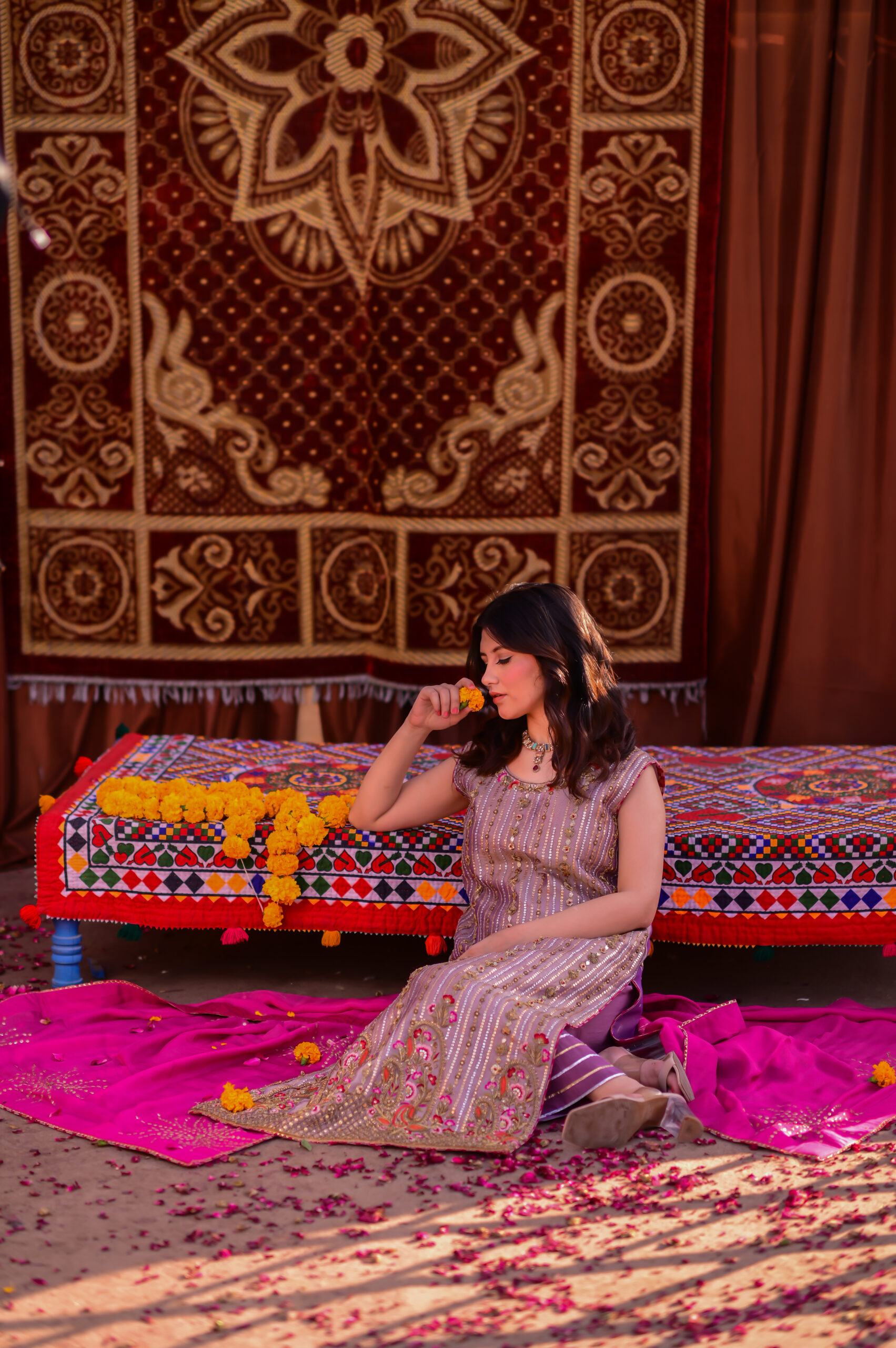 A true celebration of colors, this bahaar ensemble with a classic dhaka pajama radiates the joyous spirit of festivity. At its heart lies the vibrance of red, beautifully balanced with the soft gleam of gold accents, creating a look that is both regal and timeless. The silk dupatta drapes gracefully, adding fluidity and richness to the outfit, while the intricate detailing on the dress enhances its festive charm. Perfectly embodying the essence of Basant, this attire symbolizes beauty, tradition, and the cheerful spirit of celebration.