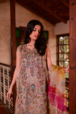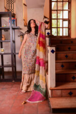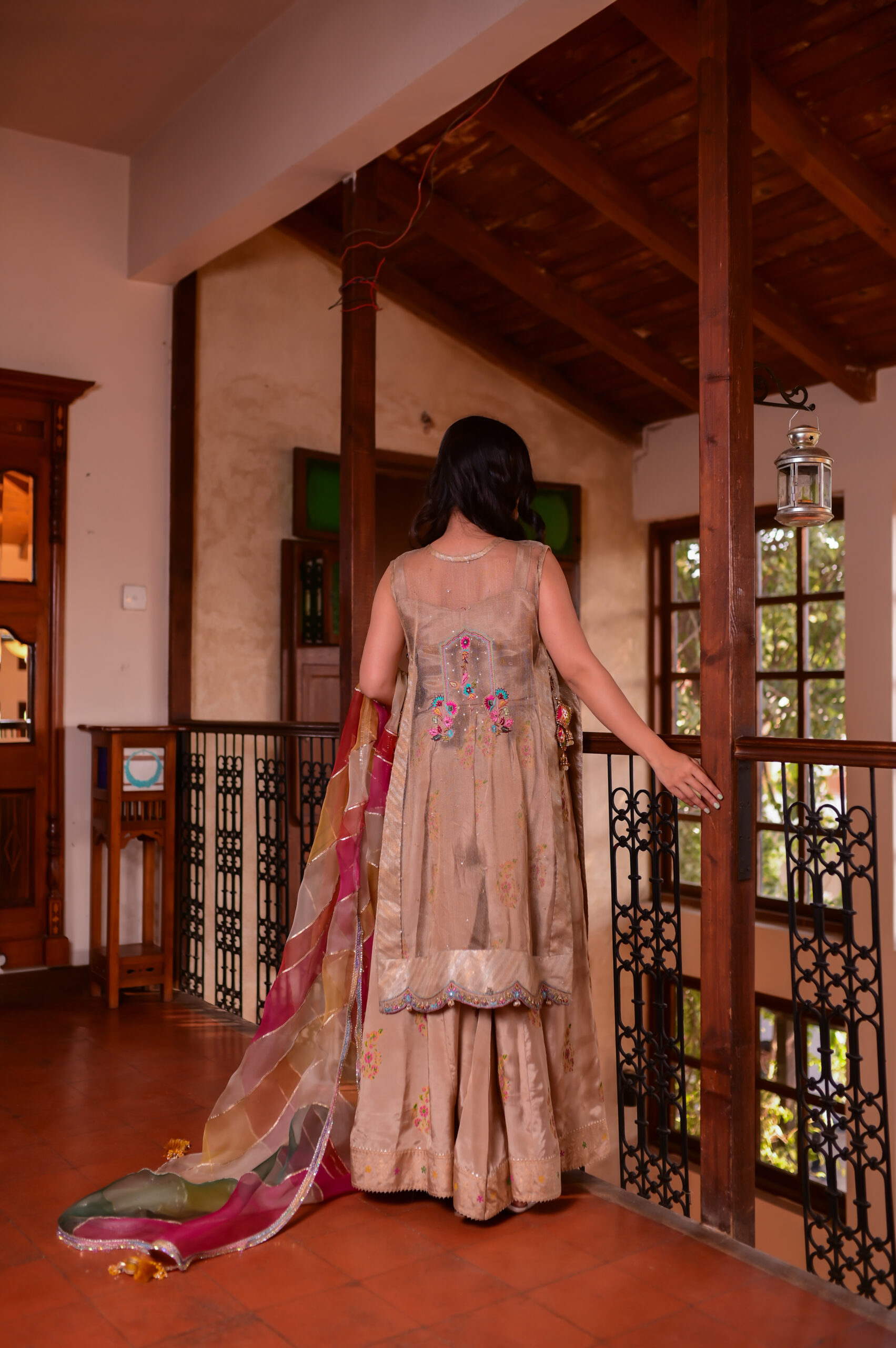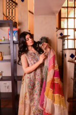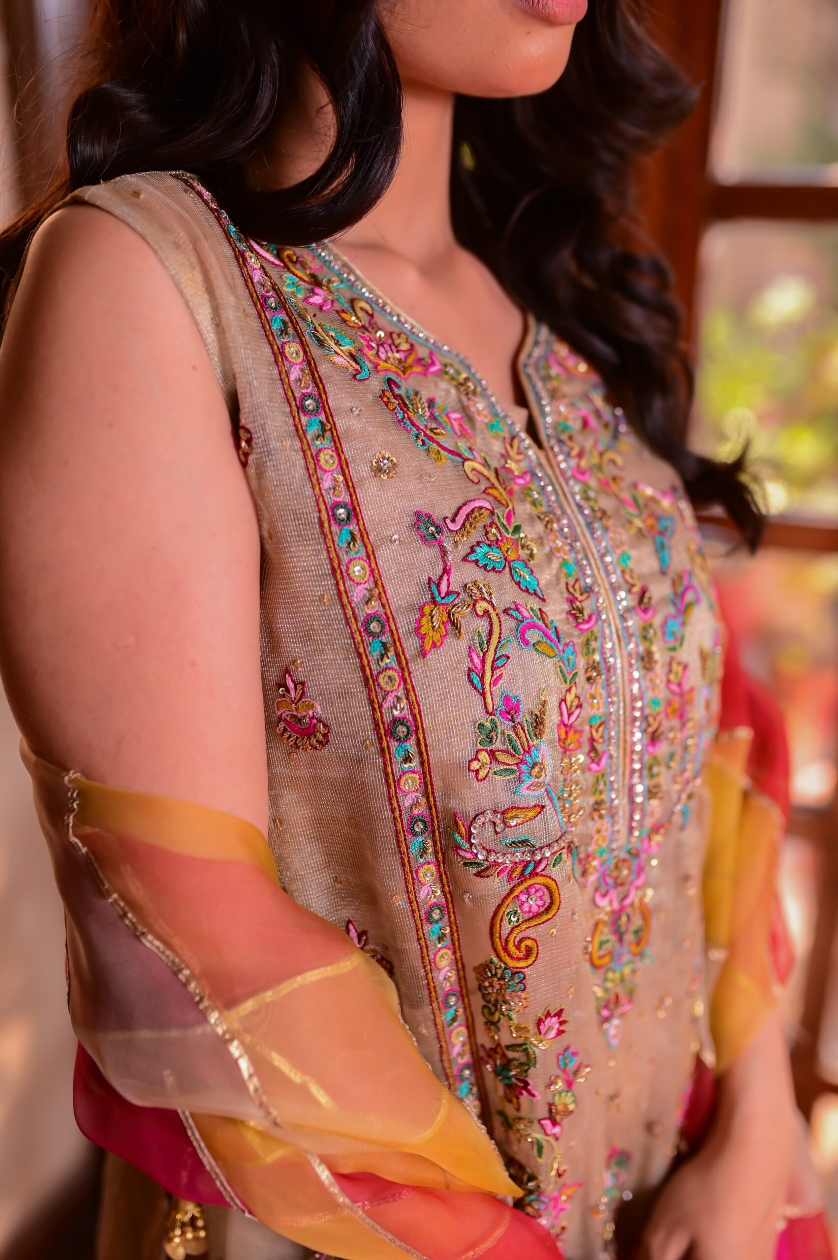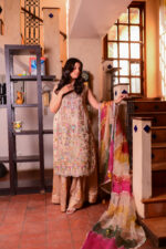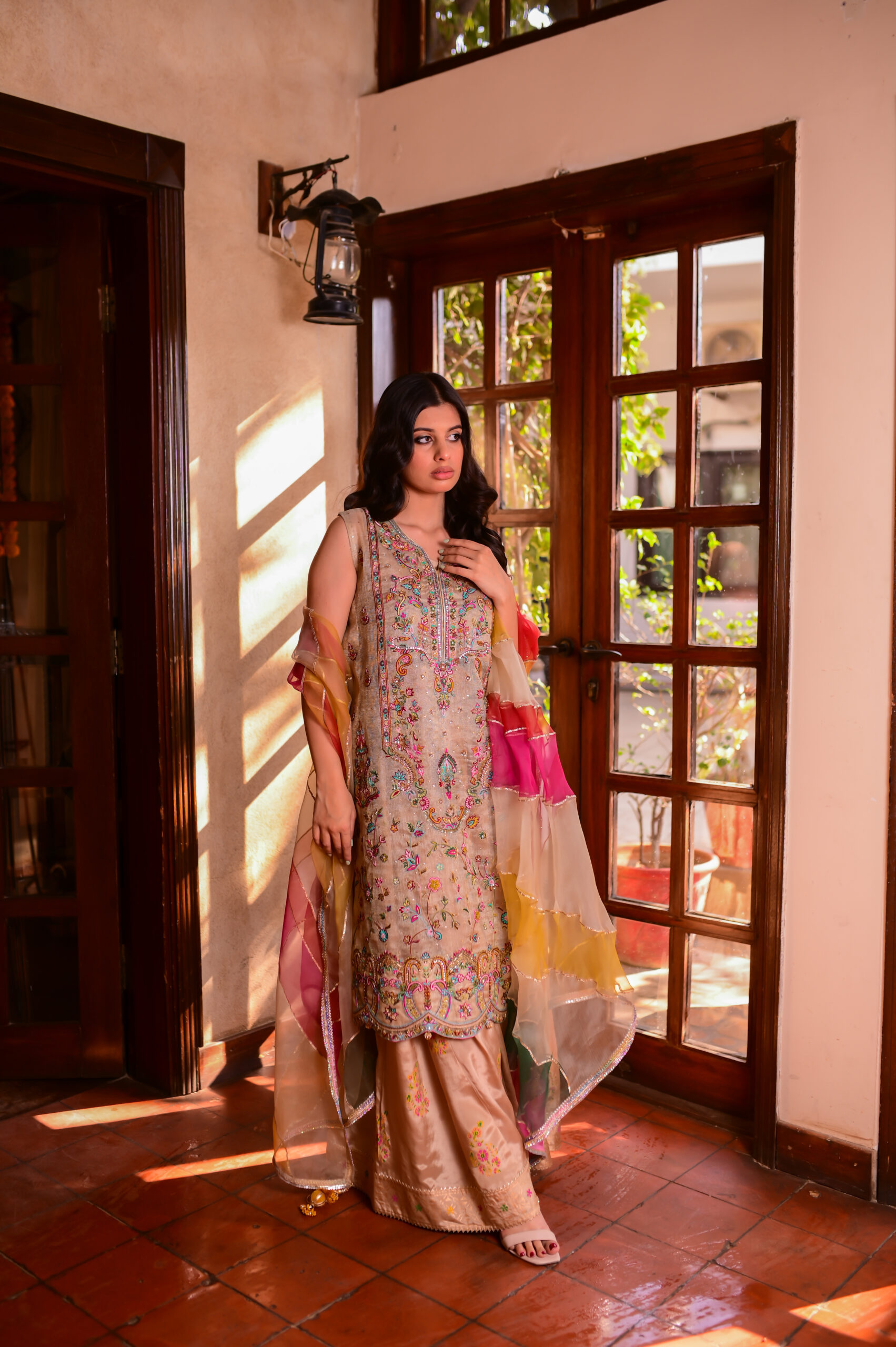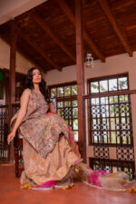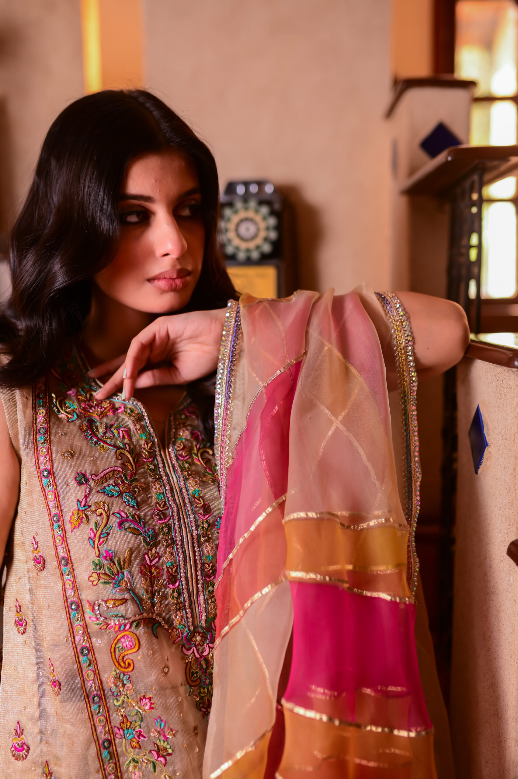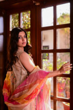 Bathed in hues of soft blush and golden sunlight, this ensemble captures the quiet poetry of elegance. Each delicate thread tells a tale of artistry — intricate, timeless, and effortlessly beautiful. The gentle flow of fabric mirrors the rhythm of a calm breeze, carrying whispers of sophistication and charm. Designed for the woman who moves with grace and speaks in style, this look celebrates subtle luxury — a perfect harmony of tradition and modern allure. In every step, there’s confidence; in every fold, there’s a story woven with love and finesse.